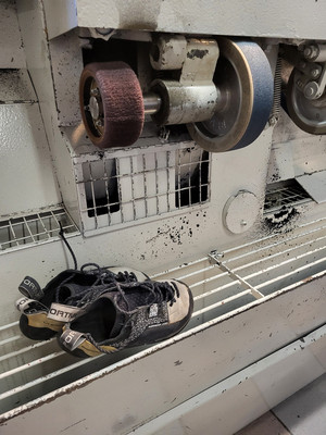 Une fois les chaussons encollés, François les met quelques minutes au four avant de les passer dans la presse orthopédique : 2 bars de pression pour coller définitivement la nouvelle semelle au chausson.