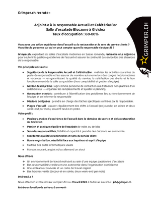 Grimper.ch betreibt 6 Kletternhallen, die sich in den Kantonen Freiburg, Genf und Waadt befinden und rekrutiert Personal für verschiedene Bereiche (Routen- und Bouldereröffner, Empfangspersonal, Kursleiter, Administration...)