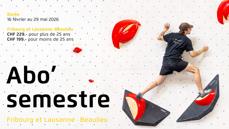 L’abo semestre c’est l’abo de saison pour toutes et tous, calqué sur les dates du semestre universitaire. Le pass idéal pour grimper en illimité ce printemps dès le 16 février jusqu’au 29 mai. Au fait, dès le 1er juin, vous pouvez enchaîner avec l’abo d’été ! Et voilà, l’année est pliée !