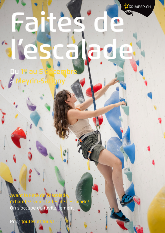 Du lundi 1er au vendredi 5 décembre, dans notre salle de Satigny, nous assurons l’échauffement. L’idéal pour être en forme pour la Fête de l’escalade. Et pour marquer le coup, nous offrons une boisson à toutes celles et tous ceux qui réussiront les défis.