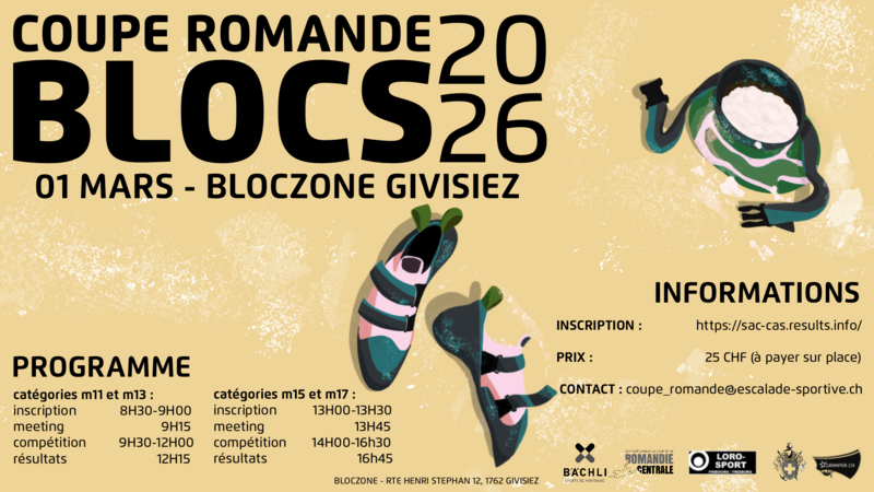 Dimanche 1er mars, notre salle de Givisiez accueille les jeunes pour une coupe romande d’escalade de bloc. Les catégories U11 et U13, U15 et U17 vont tout donner sur les blocs spécialement conçus par nos ouvreurs pour l’événement.